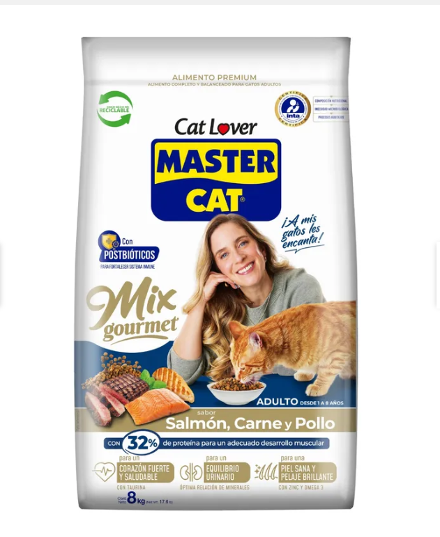 -Más proteína: Las proteínas son de vital importancia ya que ayudan a la formación de tejidos, al desarrollo de la masa muscular y aportan una mejor digestibilidad para tu gato. -Salud urinaria: Sabemos que los cálculos renales son una preocupación para los Cat Lovers. Es por esto que Master Cat contiene niveles equilibrados de Calcio y Fósforo, logrando un balance de minerales que favorece un pH ligeramente ácido, reduciendo así, la formación de cálculos renales en las vías urinarias de tu gato. -Control bolas de pelo: Los gatos son muy limpios y acicalan su cuerpo regularmente. Al hacerlo, pueden tragar parte de su pelaje formando bolas de pelo en su estómago. Por eso Master Cat incorpora Zinc Orgánico, para evitar la caída de pelo durante el acicalamiento y Fibra que permite un mejor tránsito de estos pelos que pudieran ser tragados. -Pelaje sano y brillante: Los Cat Lovers sabemos lo importante que es ver a nuestro gato con un pelaje suave y brillante. Pensando en ello Master Cat incorpora ácidos grasos Omega 3 en su fórmula para que su pelaje siempre esté sano.